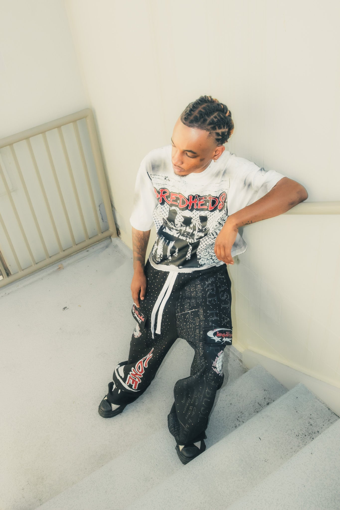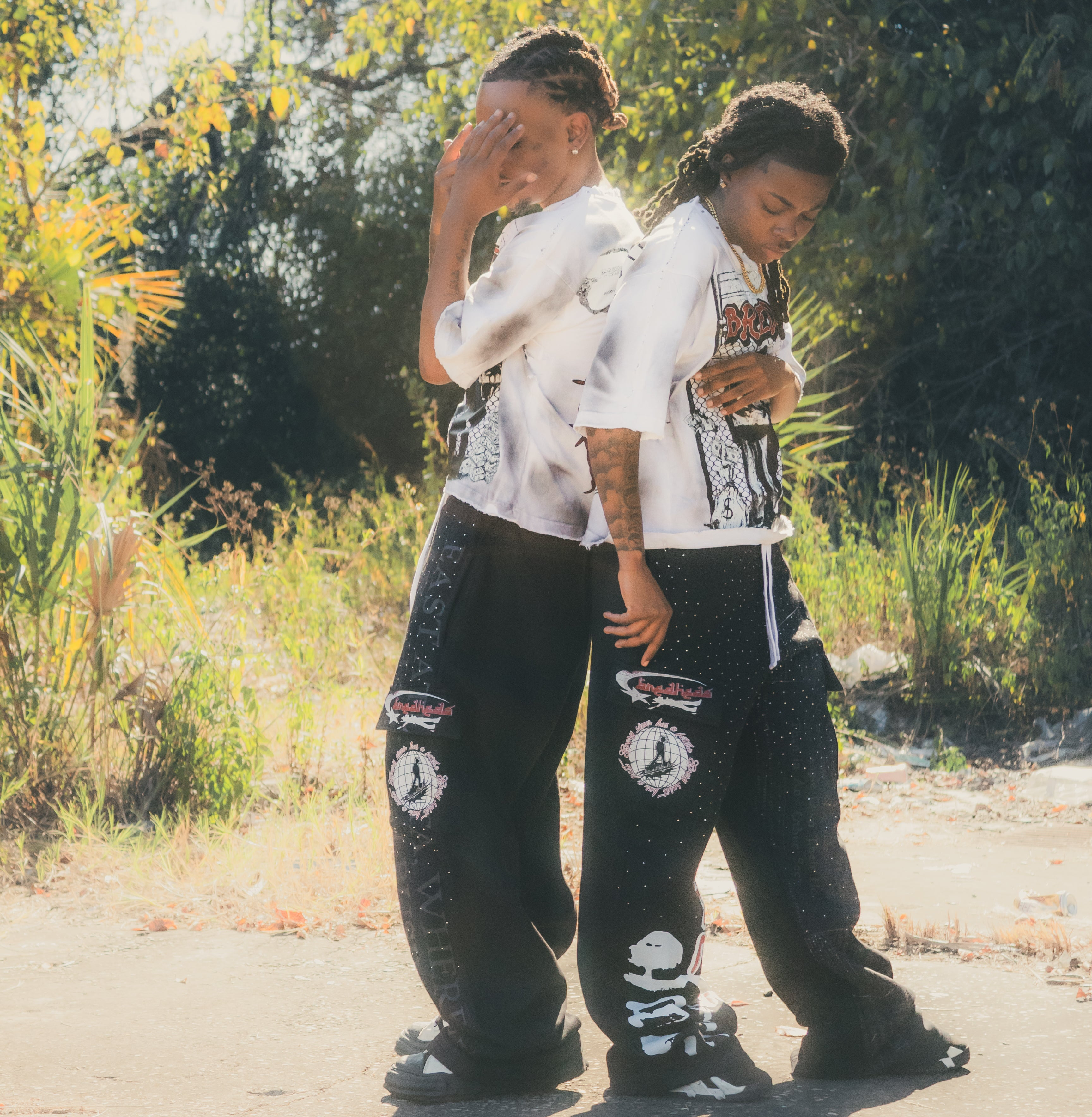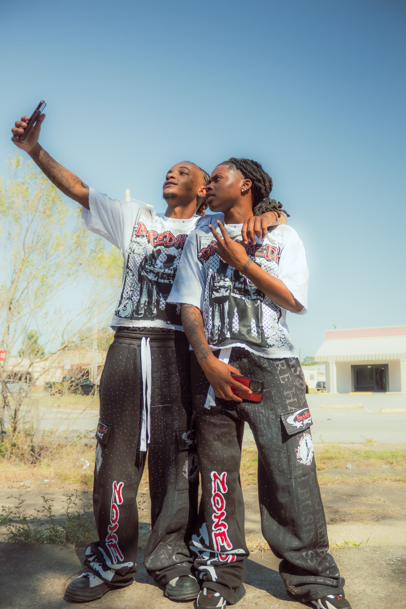 Heavyweight cotton , oversized harujuku Zone 6 Uniform sweats featuring a double-waist design, sun-bleached wash, rhinestone detailing, and ATL streetwear cargo pockets. Built for the official Zone 6 look.